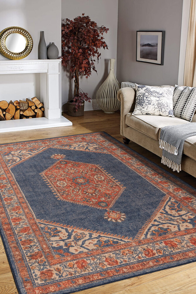 Vintage Patterned Woven Base Decorative Navy Blue Rug